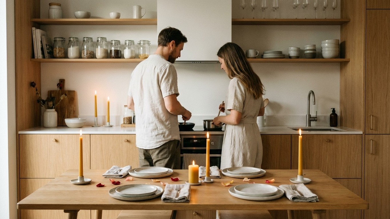 La cuisine devient un terrain de jeu complice où la fête des amoureux est surtout l’occasion de cuisiner à quatre mains, sans chercher la perfection. Ouvrez une bonne bouteille, lancez la playlist de votre couple et prenez simplement plaisir à cuisiner ensemble. Pas besoin de menu gastronomique : même des pâtes carbo aux chandelles, ça a du charme (et beaucoup). Cette approche décontractée libère la pression et permet de savourer l’instant présent. Vous avez sûrement vu passer cette adorable tendance sur TikTok, celle de couples qui s’amusent à préparer eux-mêmes leurs pizzas avec les aliments de leur choix et surtout en donnant à la pâte une forme de cœur.